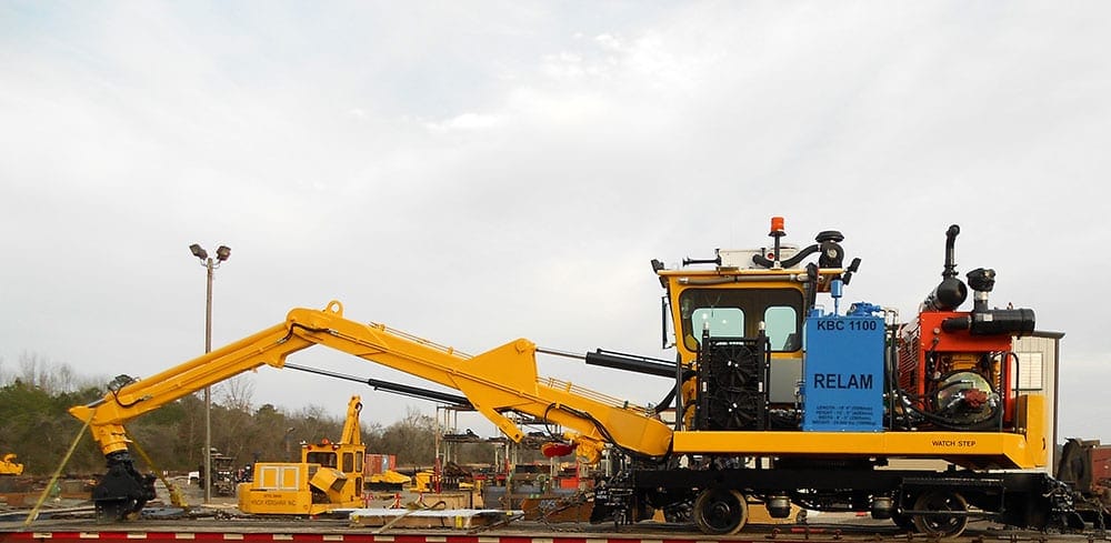 Center locking rail dogs clamp the machine to the rails for working over the side. The upper deck and tie grapple are capable of 360-degree rotation. Boom and grapple design provides the ability to replace ties, caps, and stringers quickly, with minimal manpower.